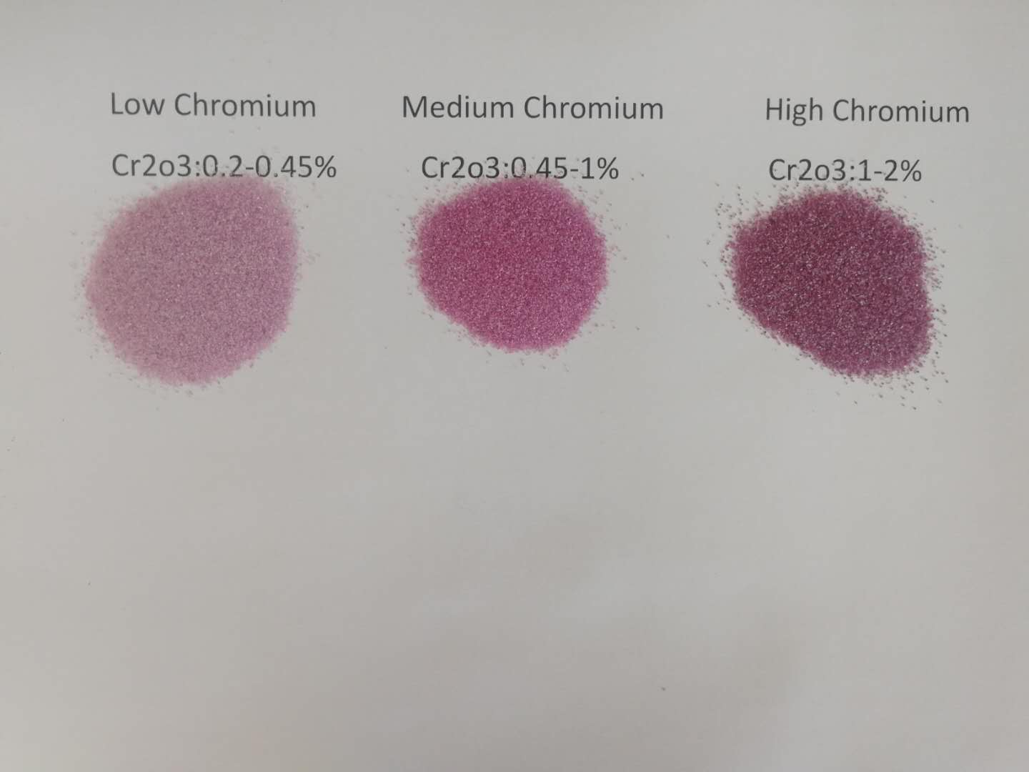 鉻剛玉的顏色主要受氧化鉻的影響,低鉻剛玉的鉻含量0.2-0.45%呈現(xiàn)淺粉色